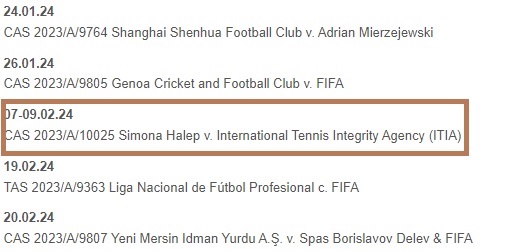 „07-09.02.24 – CAS 2023/A/10025 Simona Halep v. International Tennis Integrity Agency (ITIA)”, este anunţul de pe site-ul Tribunalului de Arbitraj Sportiv.