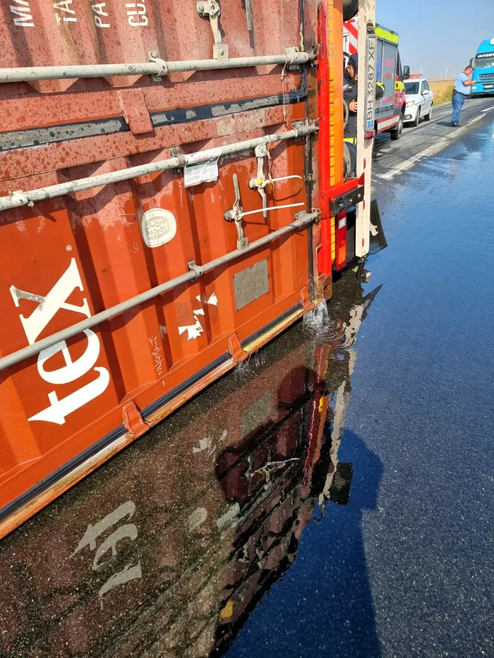 În urma evenimentului, TIR-ul a ieşit de pe şosea, răsturnându-se pe o parte.