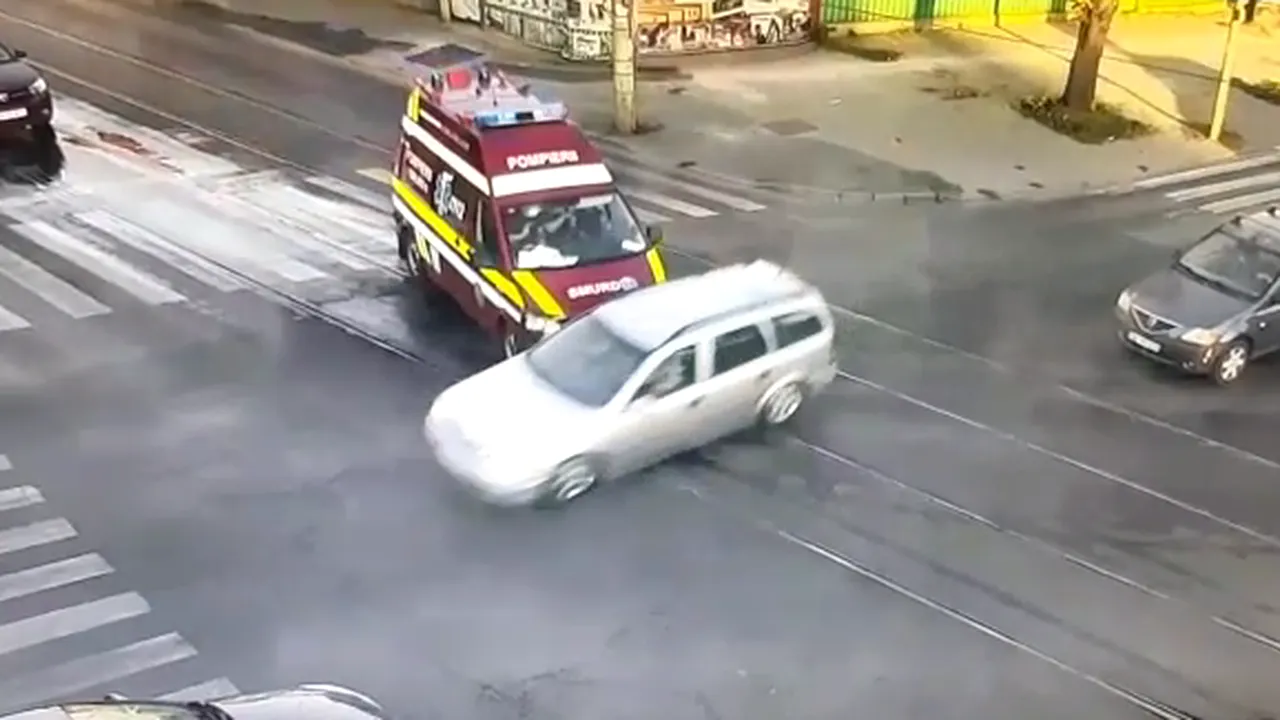 Momentul impactului a fost surprins de camerele de supraveghere din zonă, iar imagini se vede cum un autoturism de culoare deschisă pătrunde cu viteză în intersecție, iar șoferul nu observă la timp autospeciala SMURD.