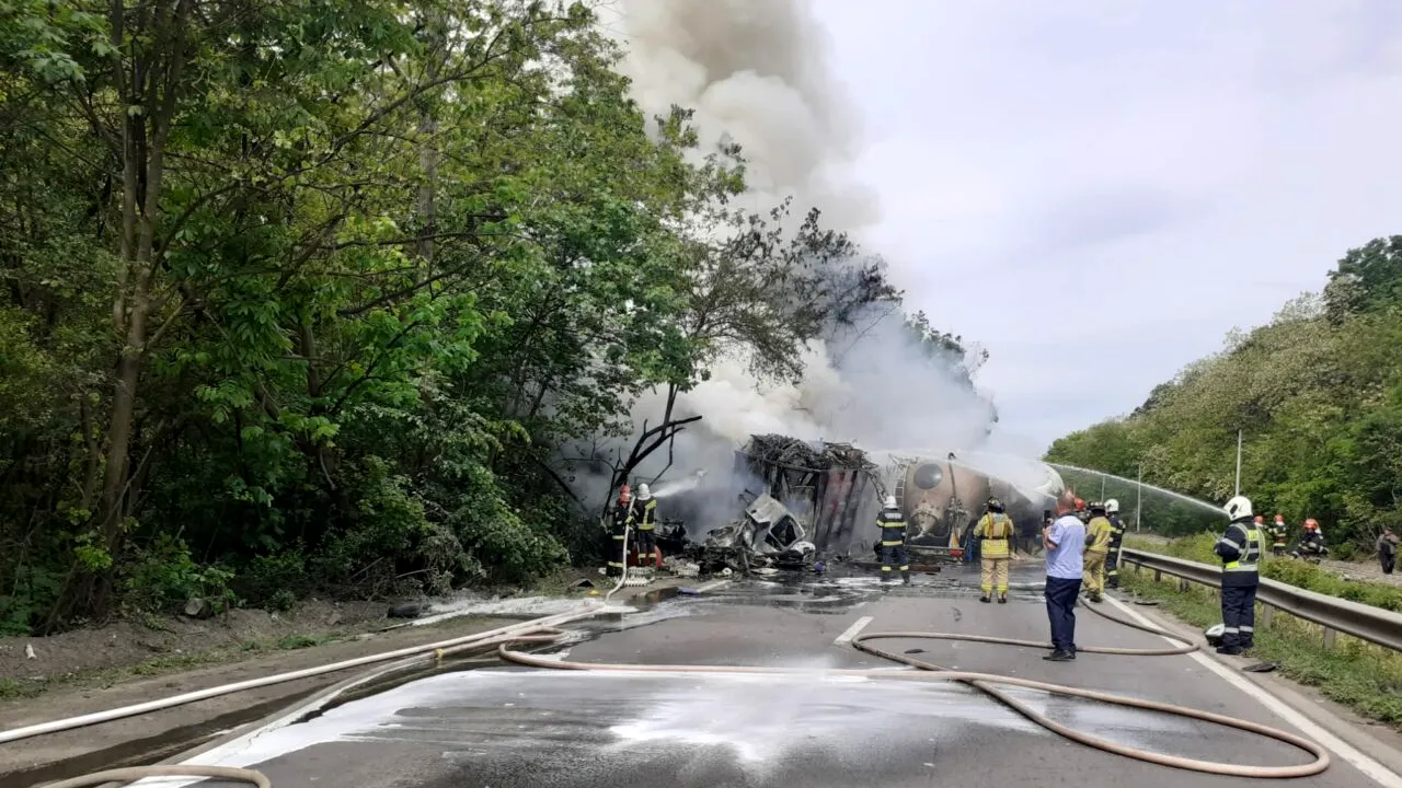 Cisterna arde cu flacără deschisă și în zonă s-a format nori mari de fum. Accidentul are loc într-o zonă împădurită, lângă calea ferată.