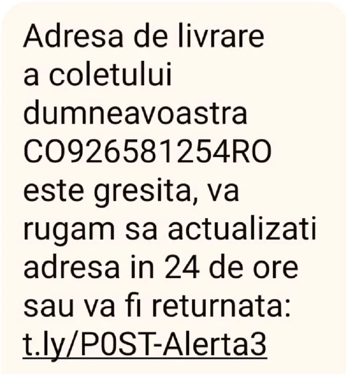 „Adresa de livrare a coletului dumneavoastră CO… este greșită, vă rugăm să actualizați adresa în 24 de ore sau va fi returnat”, este mesajul primit de o femeie din Ploiești.