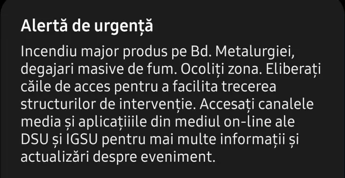 „Incendiu major produs pe bd. Metalurgiei, degajări masive de fum. Ocoliți zona. Eliberați căile de acces pentru a facilita trecerea structurilor de intervenție. Accesați canalele media și aplicațiile din mediul on-line ale DSU și IGSU pentru mai multe informații și actualizări despre eveniment”, se arată în mesajul transmis prin RO-ALERT.