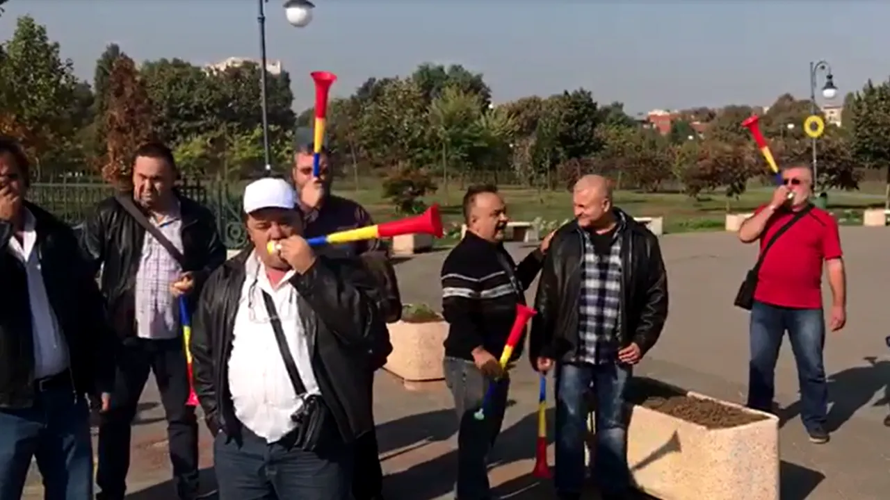 Protestul este unul pașnic, angajații venind cu vuvuzele și un banner al sindicatului.