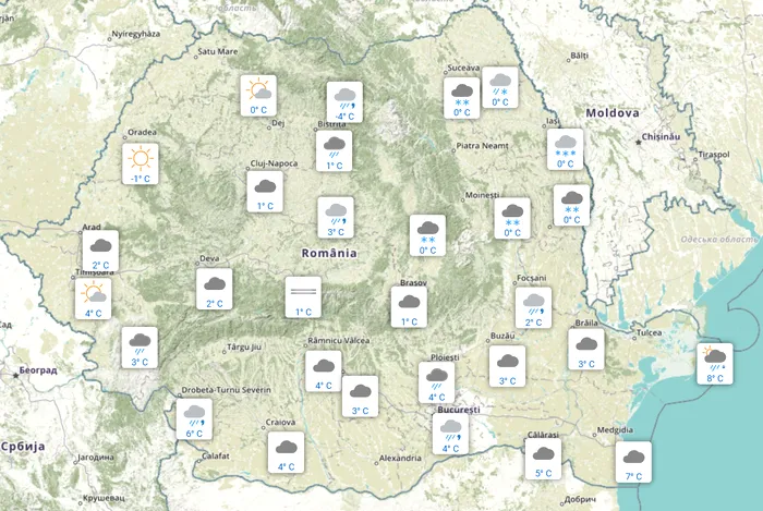 • Au fost 0 grade și ninsoare la Suceava, 0 grade și lapoviță la Botoșani, 0 grade și ninsoare la Iași, 0 grade și ninsoare la Bacău și Vaslui.