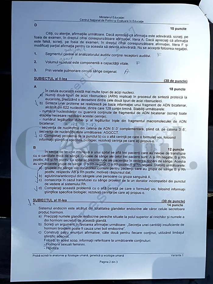 Primul subiect la BAC Biologie 2021 este notat cu 30 de puncte, la fel și subiectul al doilea și al treilea. Alte 10 puncte sunt acordate din oficiu.