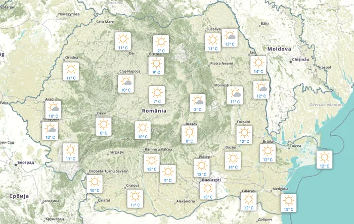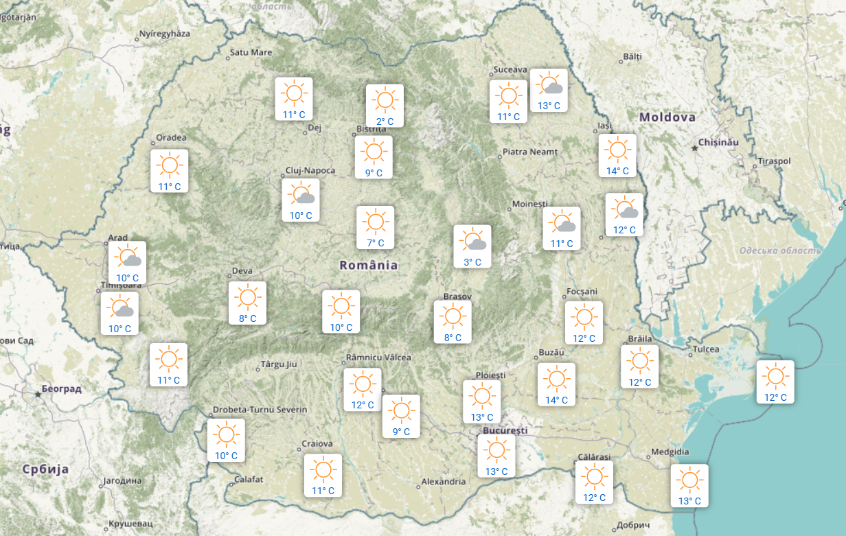 În această dimineață, la ora 10:00, potrivit ANM, cerul era senin în toată țara. Cea mai ridicată temperatură s-a înregistrat la Buzău – 14 grade Celsius.