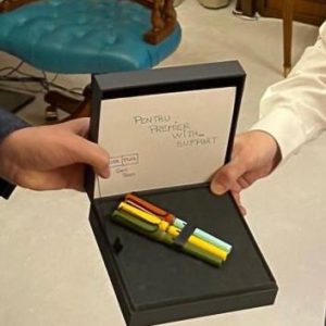 „Știți sentimentul acela când e ziua unui coleg și te gândești ce să-i faci cadou? Astăzi e ziua colegului nostru Florin Cîţu, premierul României. Împreună cu colegii Cătălin Drulă, Cristian Ghinea, Vlad Voiculescu, Claudiu Nasui, Stelian Ion, Ciprian Teleman și Sergiu Hossu am pus mână de la mână și am cumpărat trei stilouri cu care am compus culorile coaliției, am semnat o felicitare cu urări și gânduri adecvate momentului și i le-am înmânat sărbătoritului.