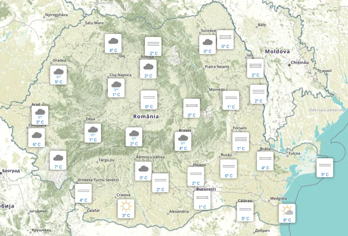 În această dimineață, la ora 07:00, termometrele au arătat minus 2 grade la Iezer, acolo unde și ceața a fost prezentă. A plouat la Oradea, Arad, Deva, Sibiu și Brașov.