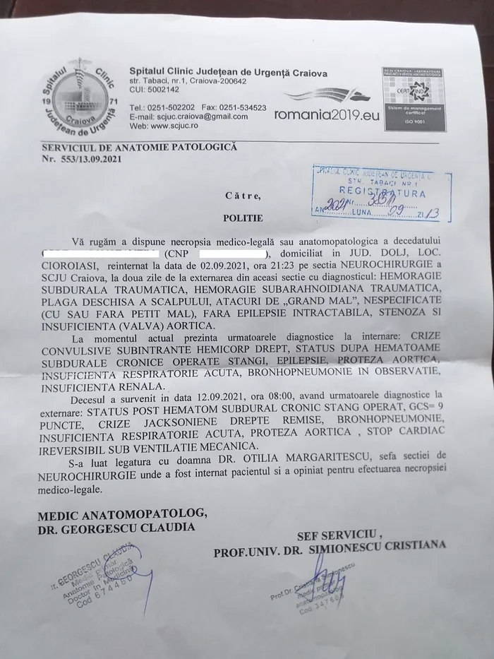 O familie din Dolj a trecut printr-o întâmplare incredibilă. Un bărbat în vârsta de 78 de ani a fost declarat mort de către medici, deși este în viață.