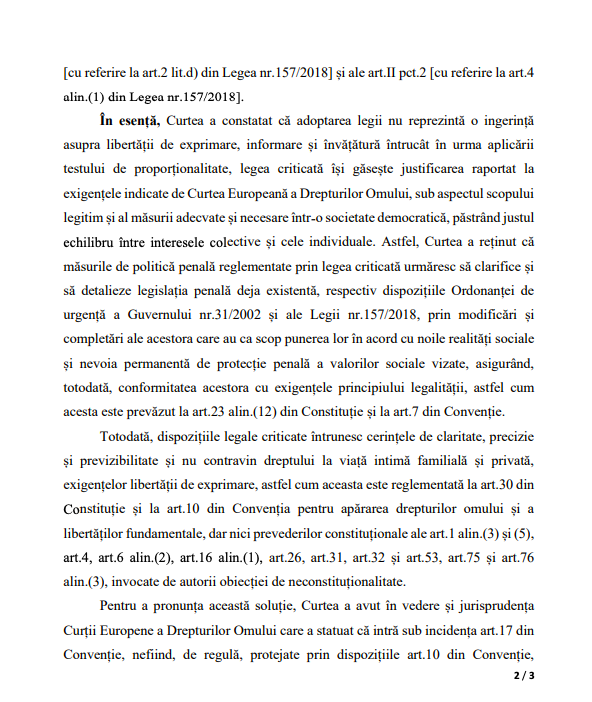 „Curtea a reținut că măsurile de politică penală reglementate prin legea criticată urmăresc să clarifice și să detalieze legislația penală deja existentă, respectiv dispozițiile Ordonanței de urgență a Guvernului nr.31/2002 și ale Legii nr.157/2018, prin modificări și completări ale acestora care au ca scop punerea lor în acord cu noile realități sociale”, se arată în comunicatul CCR.