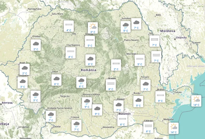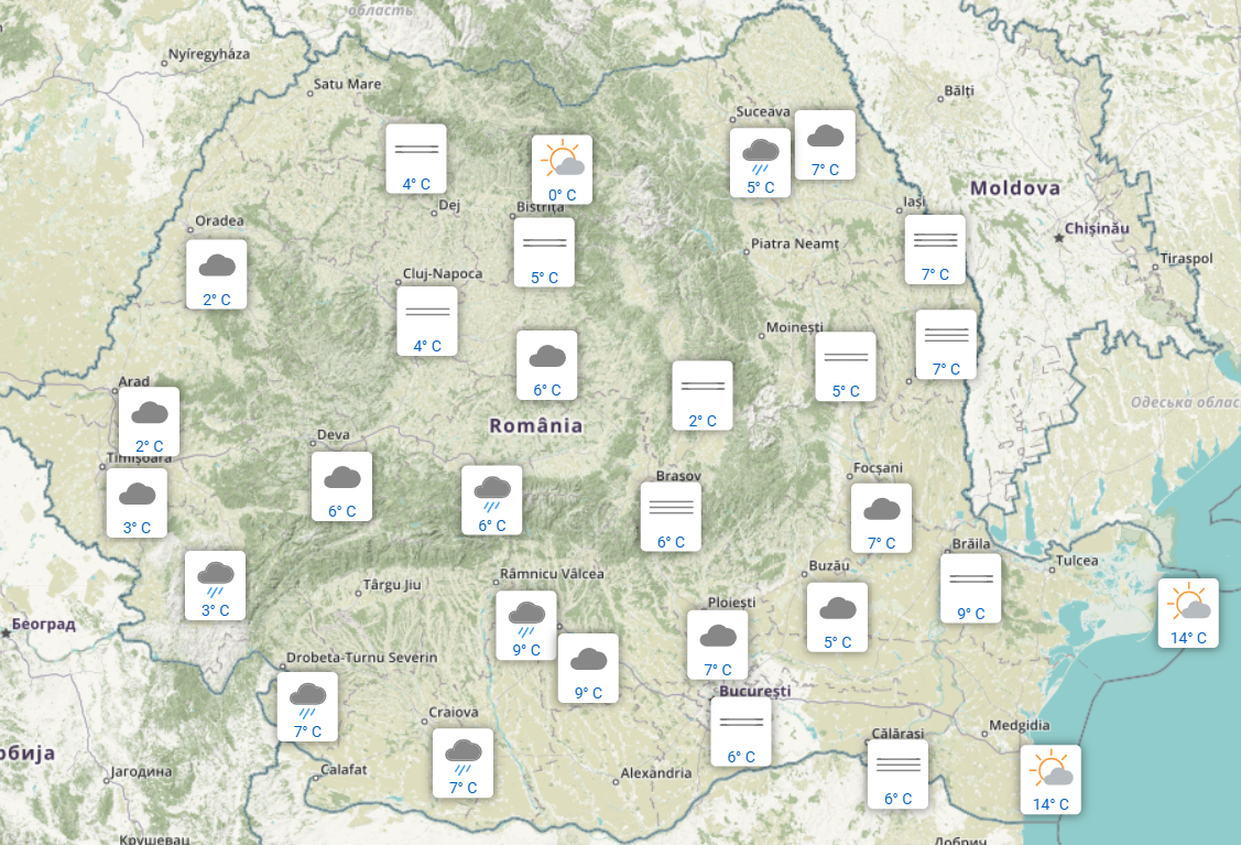 Temperaturile mai scad astăzi, în sud-vest, centru și nord-vest, comparativ cu ziua de ieri. Ieri, răcirea s-a resimțit pe vestul țării, azi mai scad. Suntem, cumva, în jurul normelor, vom avea între 4 și 10 grade.