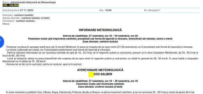• S-a emis și un cond galben, pentru 24 de ore, din această dimineață și până mâine.