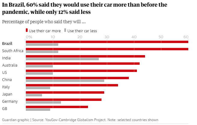 Tendința a fost, de asemenea, evidentă, dar mai puțin puternică în Marea Britanie, Italia, Germania, India și China. Deși acest lucru se poate datora parțial din cauza dificultăților unei distanțe sociale adecvate în transportul public, aceasta înseamnă mai mult trafic, mai mult congestionare și mai multe emisii.
