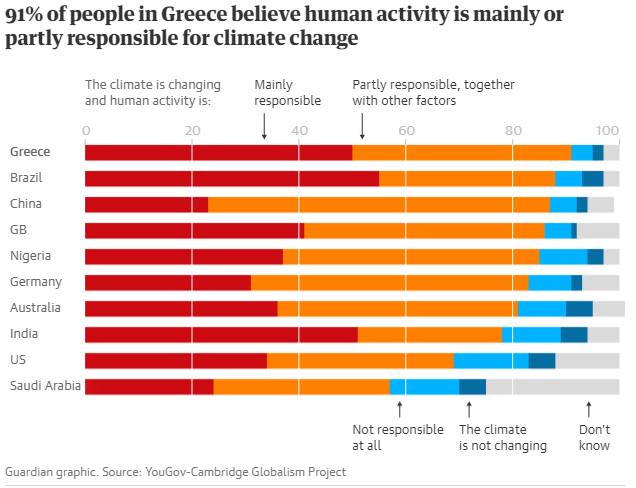 Cele mai slabe erau toate statele petroliere, deși chiar și în aceste țări – care se bazează foarte mult pe vânzările de combustibili fosili – o majoritate substanțială a recunoscut rolul umanității în perturbarea climei. Arabia Saudită a înregistrat un procentaj de 57%, apoi Egiptul cu 67% și SUA cu 69%.