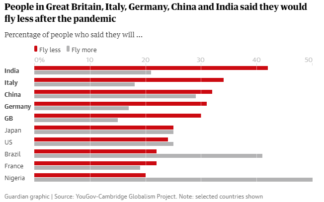 Militanții climatici au cerut o reducere a călătoriilor cu avionul, care reprezintă o mare sursă de emisii. Aceasta a scăzut semnificativ în timpul blocării coronavirusului în mai multe țări, dar a existat o discrepanță largă în ceea ce privește planurile oamenilor de a zbura după pandemie, comparativ cu înainte.