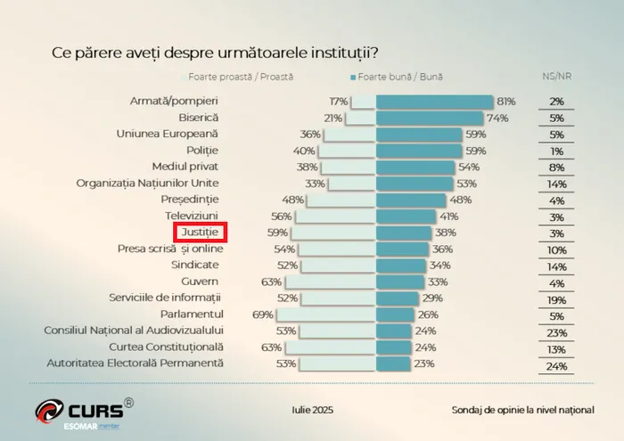 ”În rândul companiilor, percepţia cu privire la independenţa sistemului de justiţie este pozitivă în proporţie de 51%, similară celei din anul 2024 (52%), situând România lângă Franţa (53%) şi înaintea unor ţări precum Grecia (49%), Italia (48%), Spania (40%), Ungaria (38%), Portugalia (32%), Bulgaria (27%)”, a transmis CSM.