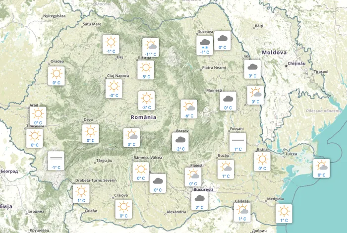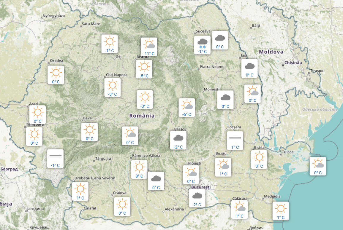 În București erau 2 grade, iar cerul era acoperit. Au fost 0 grade la Botoșani și Iași, iar pe litoral se înregistrau 0 grade la Sulina și 1 grad la Constanța.