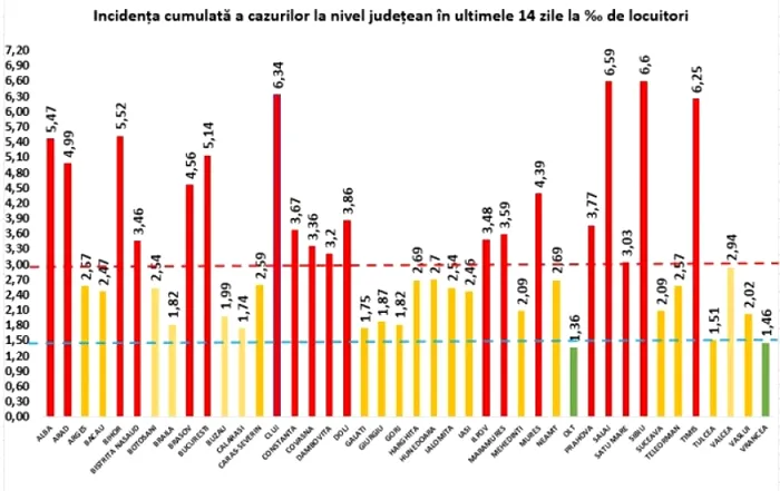 În ultimele 14 zile, în București incidența infectărilor a ajuns la 5.14, în timp ce în Cluj – 6.34, Sălaj – 6.59, Sibiu – 6.6 și Timiș – 6.25 situația este și mai critică. Peste 5, este incidența și în Alba – 5,47 și Bihor – 5,52. Tragic este faptul că niciun județ nu mai are incidența mai mică de 1.