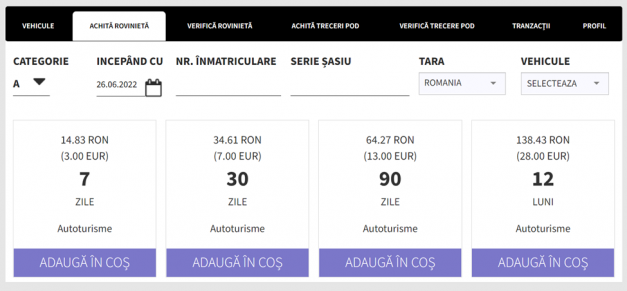 După ce contul a fost activat, trebuie înregistrat pe platformă autoturismul pentru care doriţi să achiziţionaţi rovinieta. Pe site vi se vor afişa istoricul cumpărărilor şi situaţia curentă a rovinietei achiziţionate. După accesarea secţiunii „achită rovinietă” vi se prezintă mai multe variante de achiţionare a rovinietei, în funcţie de perioadă.
