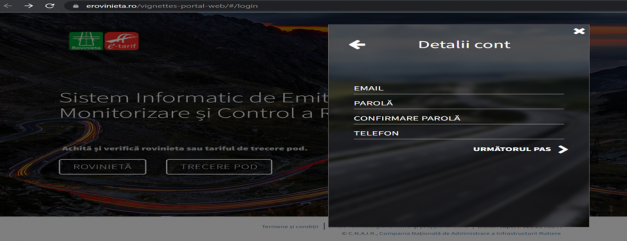 Pe prima pagină a site-ul www.cnadnr.ro, în zona centrală, se găseşte secţiunea „Rovinietă” ce este marcată cu verde. Ulterior, pentru achiţionarea rovinietei trebuie accesat link-ul „Cumpara rovinieta aici”, care deschide pagina https://www.erovinieta.ro/vignettes-portal-web/#/login.