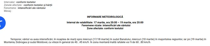 „Temporar, vântul va avea intensificări, miercuri (18 martie) în majoritatea regiunilor, iar joi (19 martie) în Muntenia, Dobrogea și sudul Moldovei, cu viteze în general de 40…45 km/h. În zona montană înaltă rafalele vor fi de 60…80 km/h”, precizează reprezentanții ANM.