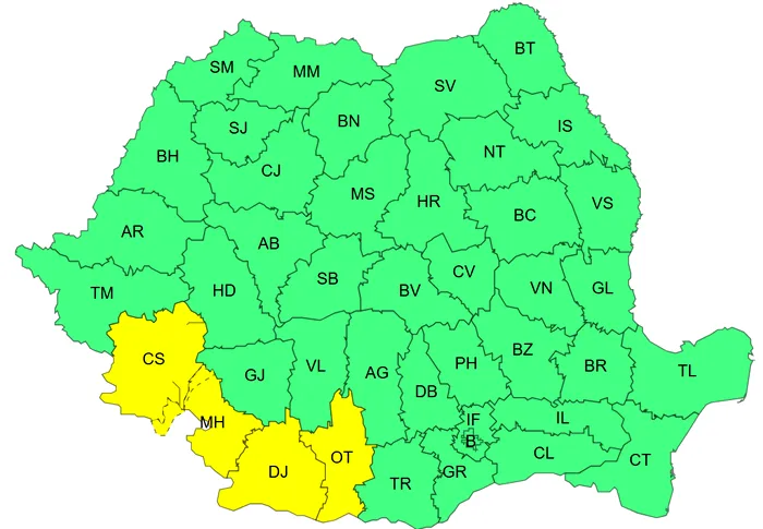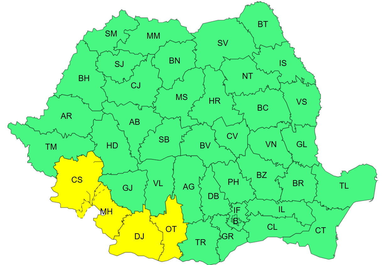 Sunt în vigoare și două coduri galbene, tot pentru intensificări ale vântului, valabile până astăzi – la ora 17:00 și la ora 20:00 -, județele vizate fiind Caraș-Severin, Dolj, Mehedinți și Olt.