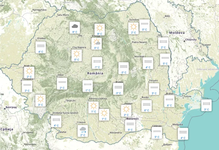 La ora 07:00, ANM a publicat și harta temperaturilor din România, iar cel mai rece – minus 3 grade Celsius – a fost la Miercurea Ciuc și la Ghimbav, în județul Brașov.