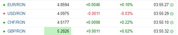 Astfel, 1 euro este cotat la 4.8594, într-o ușoară creștere față de cota înregistrată marți, de 4.8567. Dolarul, la fel, se află într-o relativă creștere față de ziua de marți. Miercuri, moneda americană are o valoare de 4.0975 față de 4.0866 înregistrată în urmă cu 24 de ore. În fine, lira sterlină, la fel ca și euro și dolar, a crescut ușor față de ziua de ieri și a ajuns la 5.2826, față de 5.2659, valoarea pe care a avut-o marți.