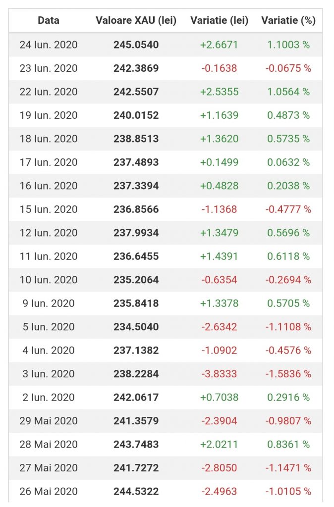 Aurul a crescut până la 245,0540 lei pentru un gram, faţă de 242,5507 lei pentru un gram, nivelul din şedinţa precedentă. Aurul a atins cel mai ridicat nivel din istorie în faţa leului pe 18 mai. Nu există date pe site-ul băncii centrale pentru valorile metalului preţios înainte de 2005.