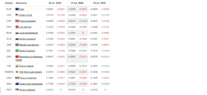 CURS VALUTAR luni, 20 iulie 2020. Banca Națională a României a oferit informații cu privire la cursul valutar de astăzi, iar valorile principalelor valute internaționale au fost afișate pe site-ul oficial.