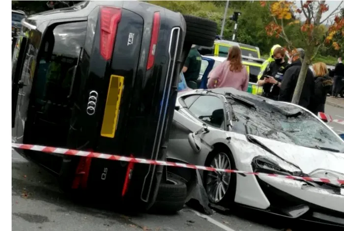 Un supercar McLaren 570GT Coupe, care costă în jur de 150.000 de lire sterline (peste 165.000 de euro), a fost declarat „daună totală”, după ce s-a ciocnit cu un SUV Audi Q5, care s-a răsturnat în urma impactului, scrie metro.co.uk.