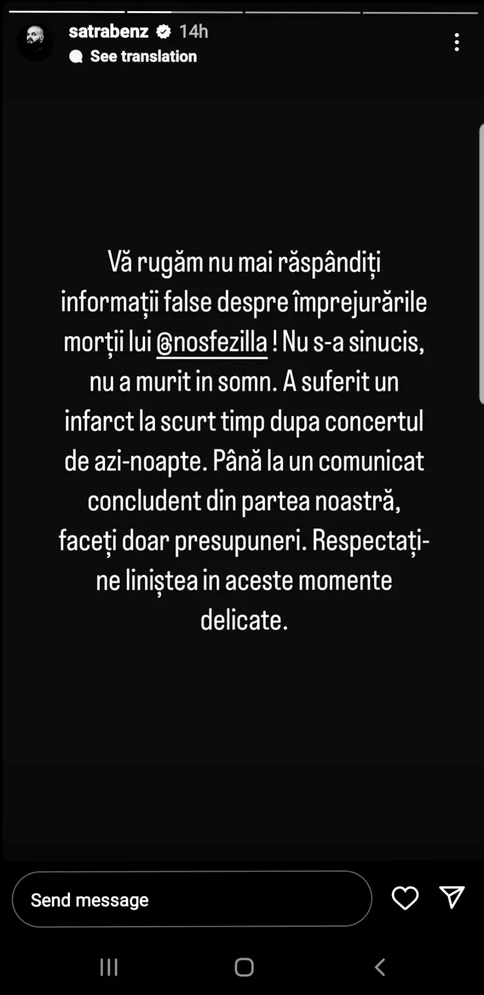 Trupa Șatra Benz a postat pe internet un mesaj pentru ca speculațiile despre moartea artistului să nu mai fie luate în considerare.