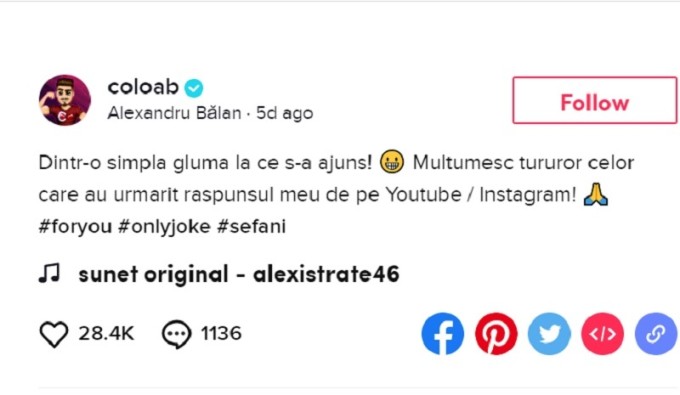 „Dintr-o simplă glumă la ce s-a ajuns!? Mulţumesc tuturor celor care au urmărit răspunsul meu de pe Youtube/Instagram”, a fost mesajul postat de Colo pe TikTok în urmă cu câteva zile.