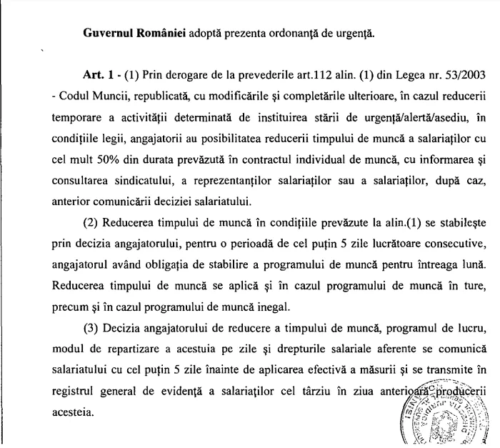 În perioada stării de urgenţă/alertă/asediu, precum şi pe o perioadă de până la 3 luni de la data încetării ultimei perioade în care a fost instituită starea de urgenţă/alertă/asediu, „angajatorii au posibilitatea reducerii timpului de muncă al salariaţilor cu cel mult 50% din durata zilnică, săptămânală sau lunară, prevăzută în contractul individual de muncă, cu informarea şi consultarea sindicatului, a reprezentanţilor salariaţilor sau a salariaţilor, după caz, anterior comunicării deciziei salariatului”, se arată în proiectul legislativ.