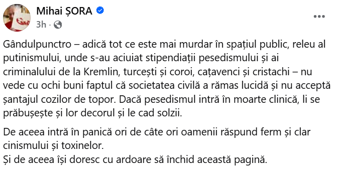 „Gândulpunctro – adică tot ce este mai murdar în spațiul public, releu al putinismului, unde s-au aciuiat stipendiații pesedismului și ai criminalului de la Kremlin, turcești și coroi, cațavenci și cristachi – nu vede cu ochi buni faptul că societatea civilă a rămas lucidă și nu acceptă șantajul cozilor de topor. Dacă pesedismul intră în moarte clinică, li se prăbușește și lor decorul și le cad solzii. De aceea intră în panică ori de câte ori oamenii răspund ferm și clar cinismului și toxinelor. Și de aceea își doresc cu ardoare să închid această pagină”, s-a scris pe pagina de Facebook „Mihai Șora”.