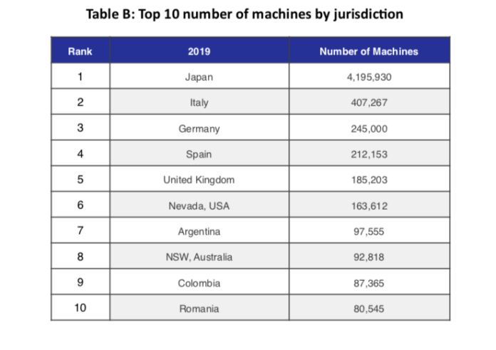 Raportul prezintă și primele poziții ale acestui clasament-supriză, Japonia deținând nu numai cele mai multe aparate de jocuri din regiunea Asia-Pacific – 4.195.930 – dar și primul loc la nivel mondial. SUA păstrează supremația în America de Nord, cu 900.704 de aparate (dintre care 163.612 se află în Nevada). Argentina este lider incontestabil în America de Sud cu 97.555, Italia domină Europa – cu 407.267 de aparate -, dar obține și locul doi mondial, iar Africa de Sud ocupă primul loc din punct de vedere al numărului de aparate în Africa, cu 37.815.