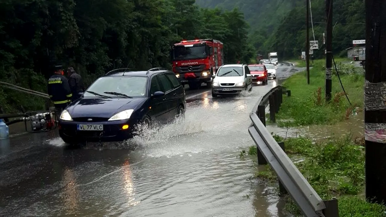 Traficul rutier se desfășoară cu dificultate din cauza apei de pe drum.