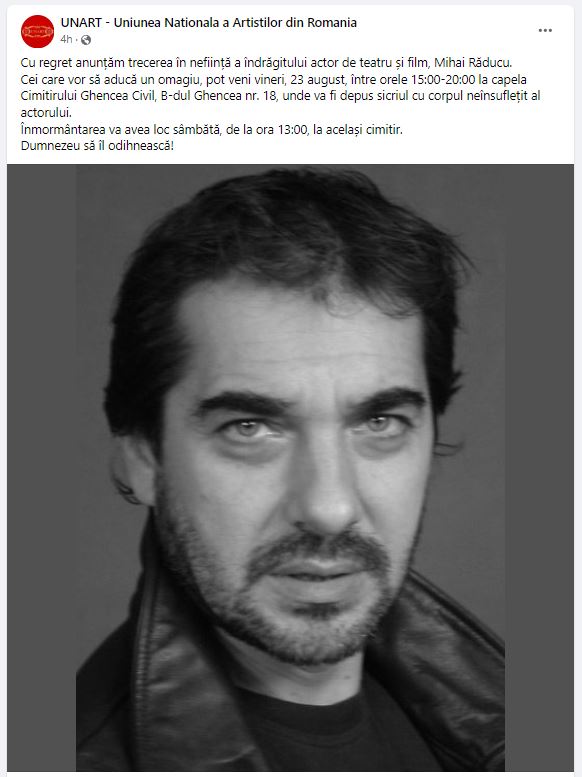 Pe rețelele de socializare, actrița Bianca Brad și-a exprimat tristețea care a învăluit-o în momentul în care a aflat că actorul Mihai Răducu s-a stins din viață. Cei doi au fost colegi de trupă, în facultate. La încheierea facultății, au jucat în „Romeo și Julieta”. Actorul a lăsat în urmă o familie îndurerată.