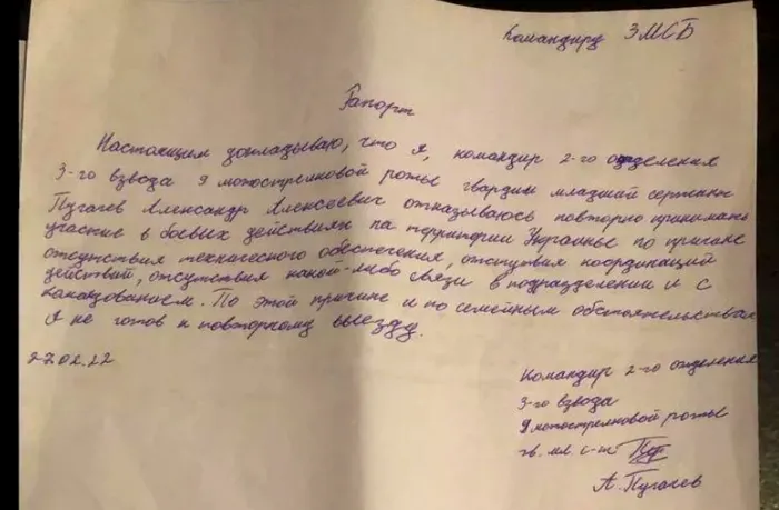Sergentul Sapar M. Mirapov a scris în declarația sa personală către comandantul unității militare de care aparține: „Prin prezenta, raportez că consider că este imposibil să fiu trimis înapoi din cauza organizării proaste a unității, lipsei de comunicații și mijloace tehnice. [În turul meu inițial], am ajuns fără să înțeleg de ce era nevoie de mine acolo, fără nicio explicație a sarcinii. Nu vreau să fiu „carne de tun”.”