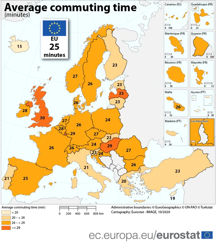 Ţările unde naveta de acasă la locul de muncă durează cel mai puţin sunt Cipru (19 de minute), Grecia (20 de minute), Italia şi Portugalia (ambele cu 21 de minute). La polul opus sunt Letonia, unde persoanele ocupate fac zilnic o navetă de 33 de minute, urmate de Ungaria şi Luxemburg, ambele cu 29 de minute.