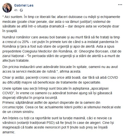„Aici suntem. În timp ce liberalii fac afaceri dubioase cu măști și echipamente medicale (poate chiar penale, dar asta o va lămuri justiția!) sistemul de sănătate se află într-o situația dramatică – dar despre asta se vorbește doar în șoaptă.
