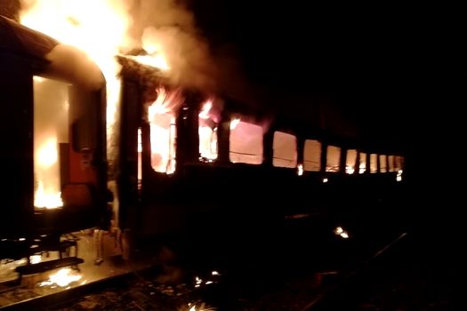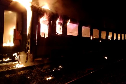 Imagini spectaculoase au fost surprinse duminică seara în județul Brașov: un vagon de tren de persoane a ars ca o torță.