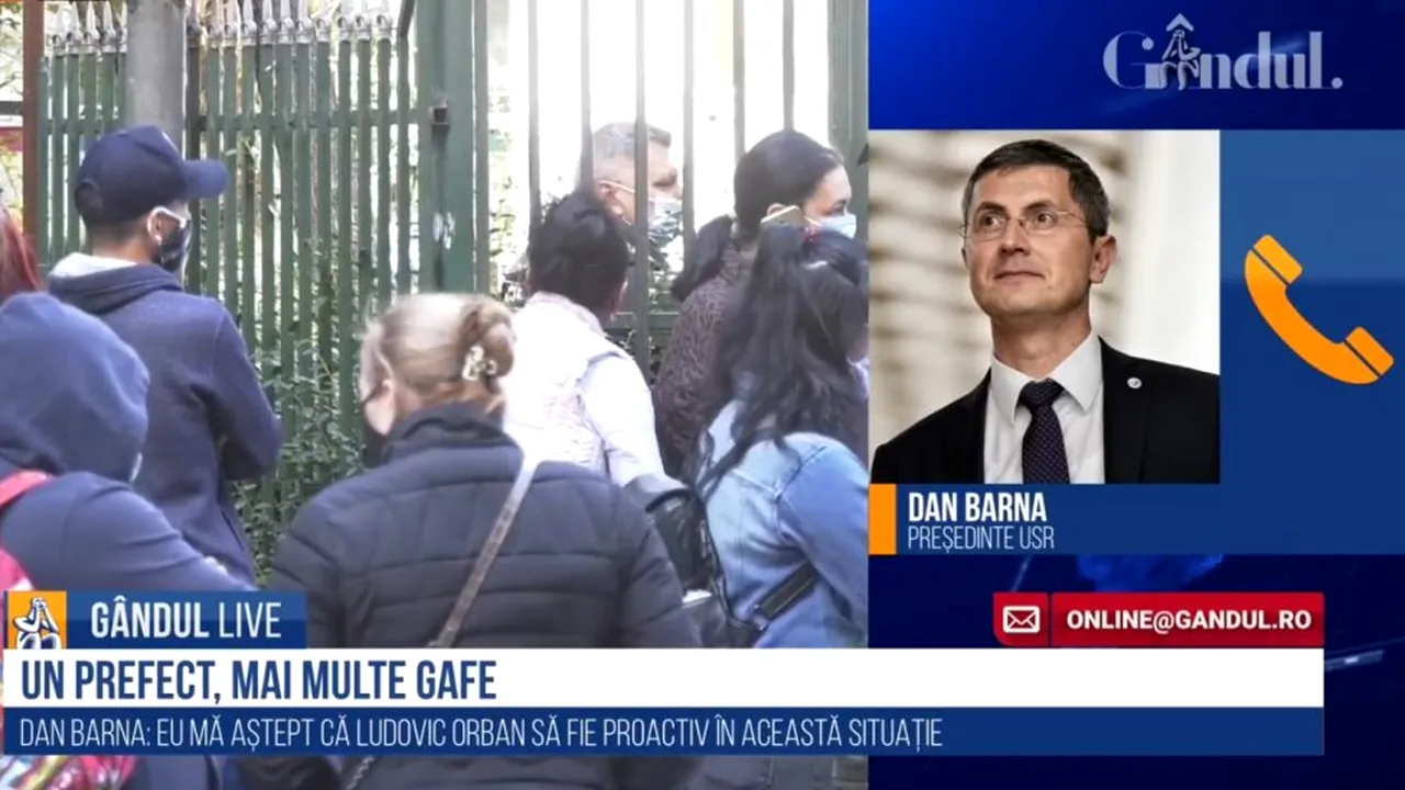 Dan Barna, liderul USR, a declarat, la GÂNDUL LIVE, că așteaptă demisia prefectului Capitalei. „Mă aștept ca premierul Orban să fie proactiv”, a mai spus Barna.