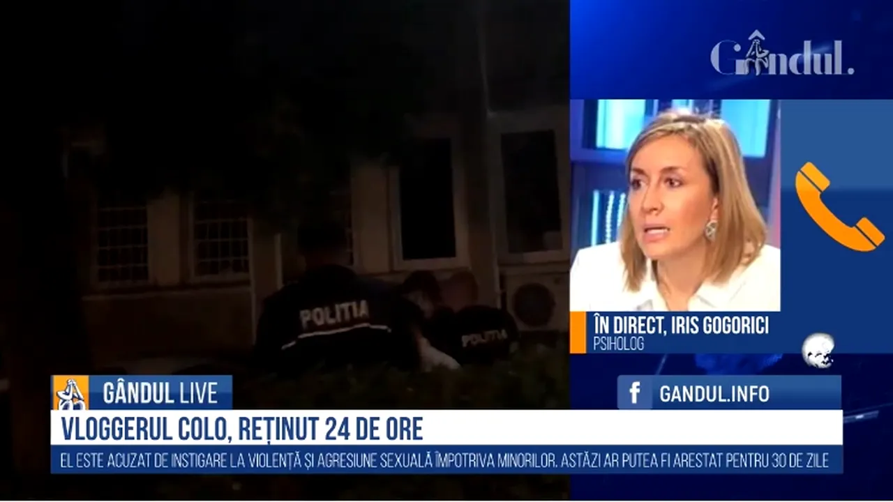 Psihologul Iris Gogorici a dezbătut, la GÂNDUL LIVE, cazul vloggerului Colo, care a fost reținut după ce a instigat la violență împotriva minorelor.