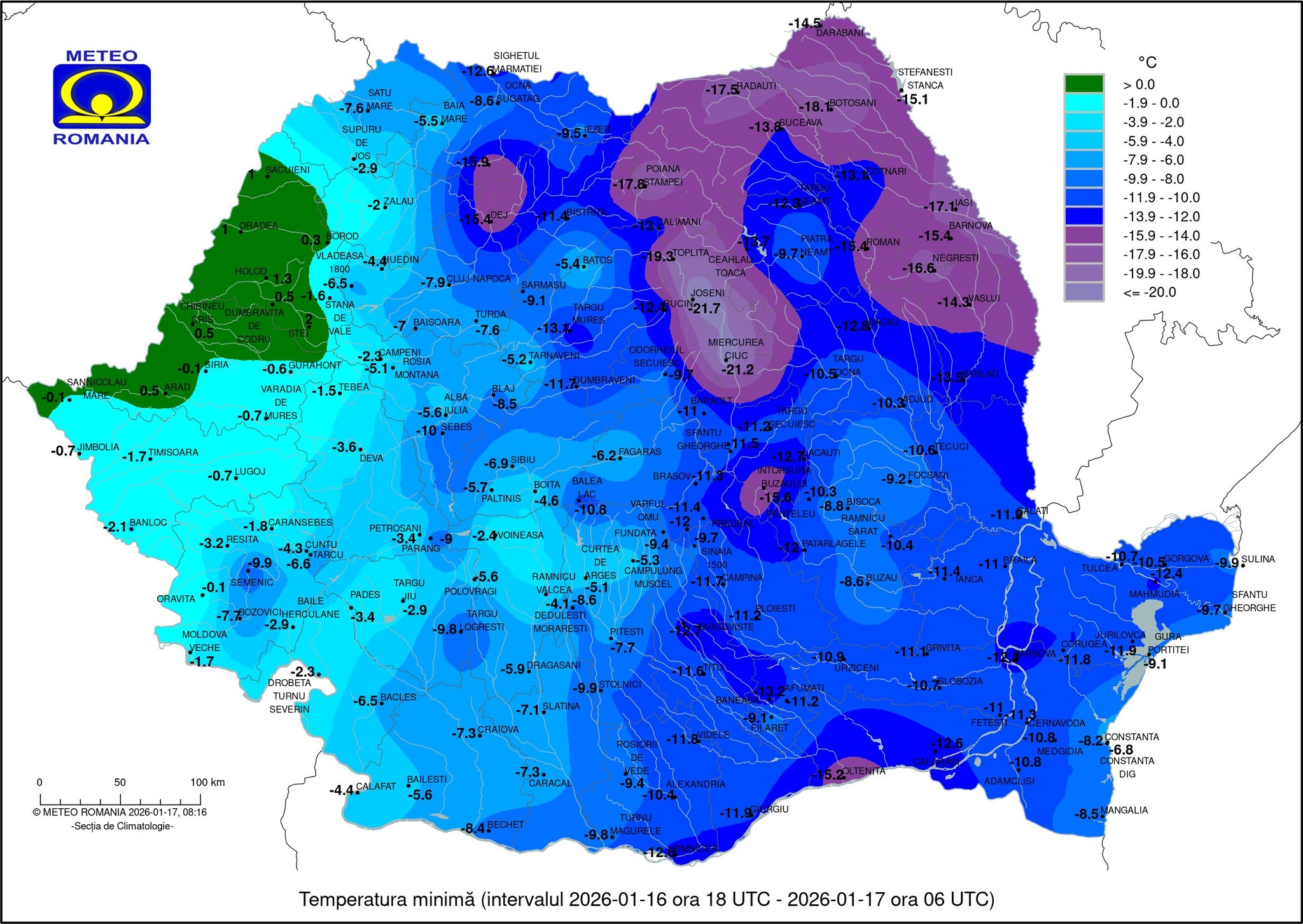 La Miercurea Ciuc au fost -21 de grade, iar la Toplița s-au înregistrat – 19 grade.
