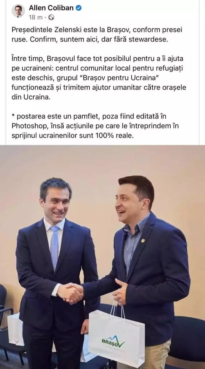 Presa locală scrie că edilul Allen Coliban a publicat acest trucaj după ce pe rețelele de socializare apăruse o altă fotografie trucată, în care Zelenski este în Brașov, într-un selfie.