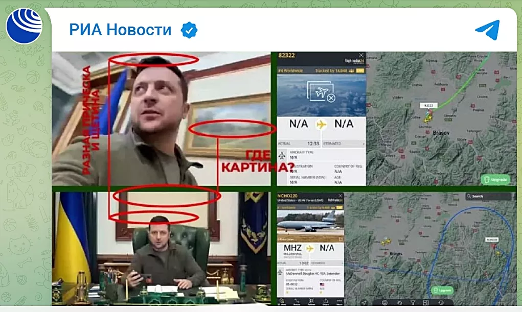 ”Președintele Ucrainei, Volodimir Zelenski, a părăsit Kievul, iar apelul pe care l-a înregistrat poate să fi fost editat, scrie canalul War on Fake Telegram… Locația probabilă a lui Zelenski este orașul românesc Brașov: utilizatorii site-ului Flightradar au atras atenția asupra unei aeronave neidentificate care a decolat de la granița dintre Ucraina și România, însoțită de elicoptere ale Forțelor Armate ale Ucrainei. Este posibil, scrie canalul, ca avioanele să-l transporte pe Zelenski și echipa sa.”, scria Ria.ru.