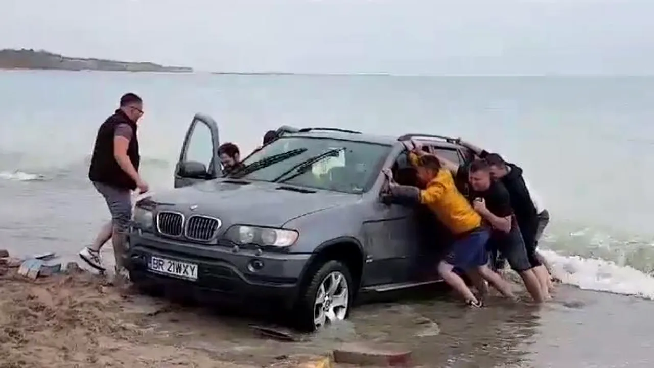 Incidentul a fost filmat, iar în imagini se observă cum autoturismul de lux este împotmolit în nisip, în timp ce este scăldat de valurile mării.