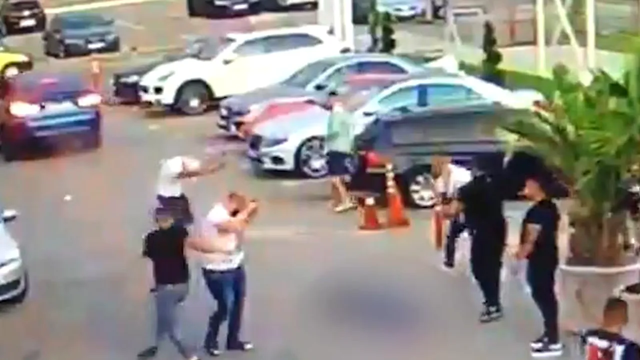 În imagini se vede cum unul dintre cei implicați în conflict îl lovește pe altul, cu pumnul și apoi cu piciorul, iar cel lovit cade la pământ.