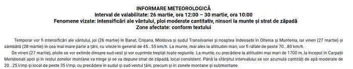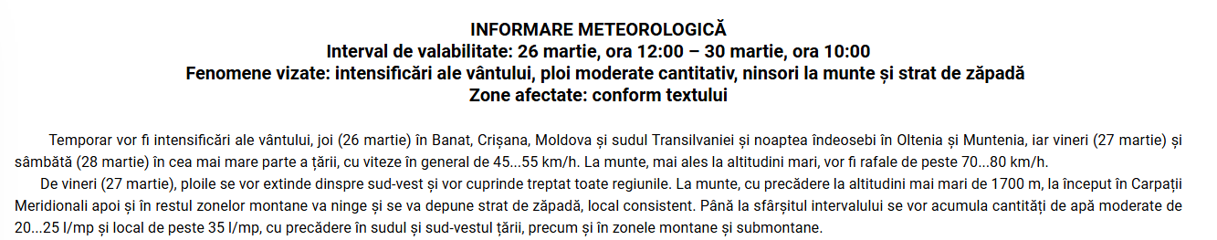 Meteorologii ANM au emis și o informare meteorologică valabile pentru intervalul 26 martie, ora 12:00 – 30 martie, ora 10:00.